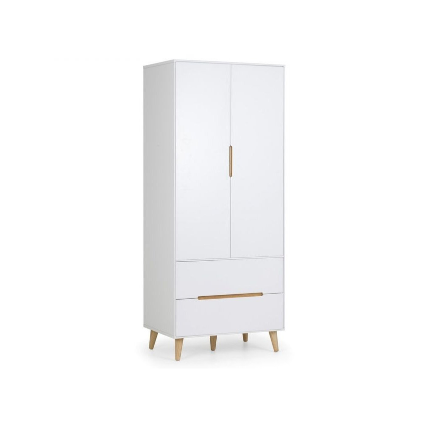 Elevate your bedroom with the Alicia Wardrobe, a stylish piece that blends retro inspiration with modern functionality. Finished in immaculate matt white lacquer, this wardrobe features two spacious drawers and is complemented by tapered oak finish legs. The recessed handles provide effortless opening while enhancing the sleek Scandinavian design, making it a perfect fit for any décor.