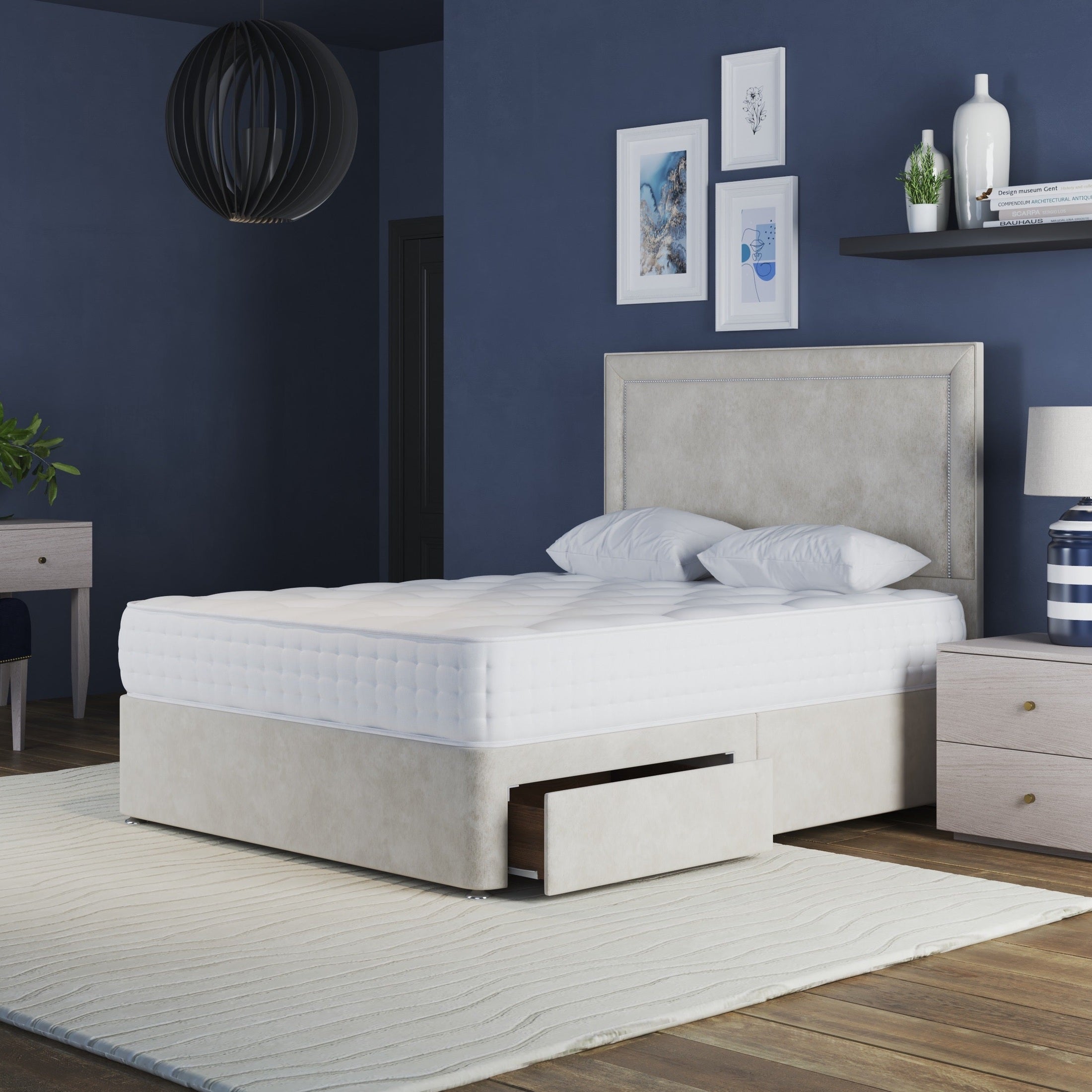 Elevate your bedroom decor with our Luxury Divan Bed Base and Studded Headboard, a perfect blend of style, comfort, and functionality. Choose your preferred drawer option, size, and fabric to create a bed that’s uniquely yours.