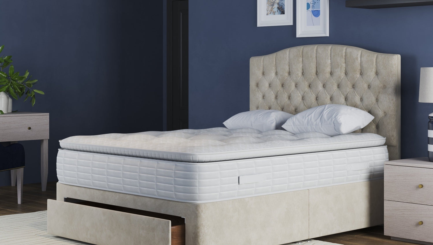 Elevate your bedroom with our luxurious chenille fabric divan bed, featuring a large end drawer for convenient storage, sturdy chrome legs, and non-slip fabric. This bed combines practical storage solutions with a touch of elegance, ensuring you enjoy both functionality and style. Enhance your sleeping experience and bedroom aesthetics with this elegant and versatile divan bed today.