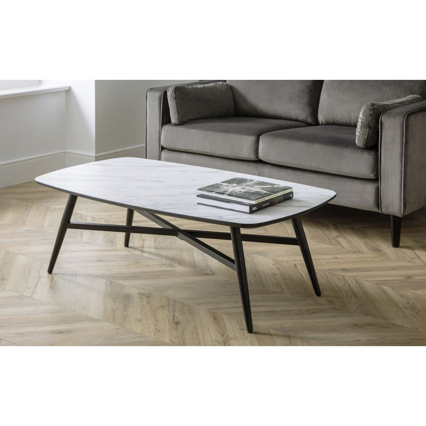 The Caruso Coffee Table offers a stunning focal point for your living room, featuring a large rectangular surface perfect for gathering around. Crafted from durable MDF with a striking white marble effect finish, this coffee table exudes sophistication while seamlessly fitting into modern décor styles. Supported by sleek black powder-coated steel cross legs, the Caruso Coffee Table combines elegance with functionality, making it a must-have addition to your living space.