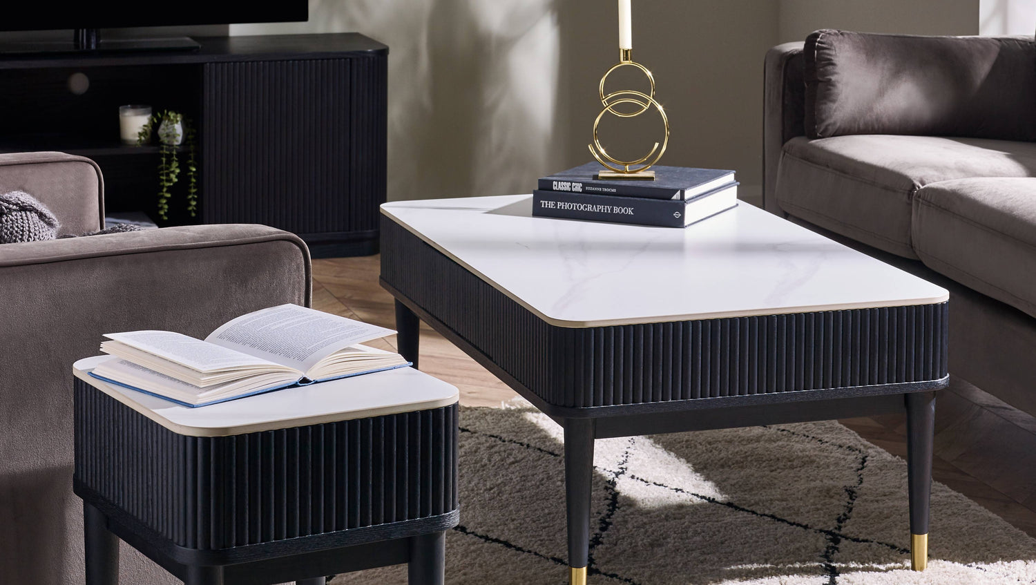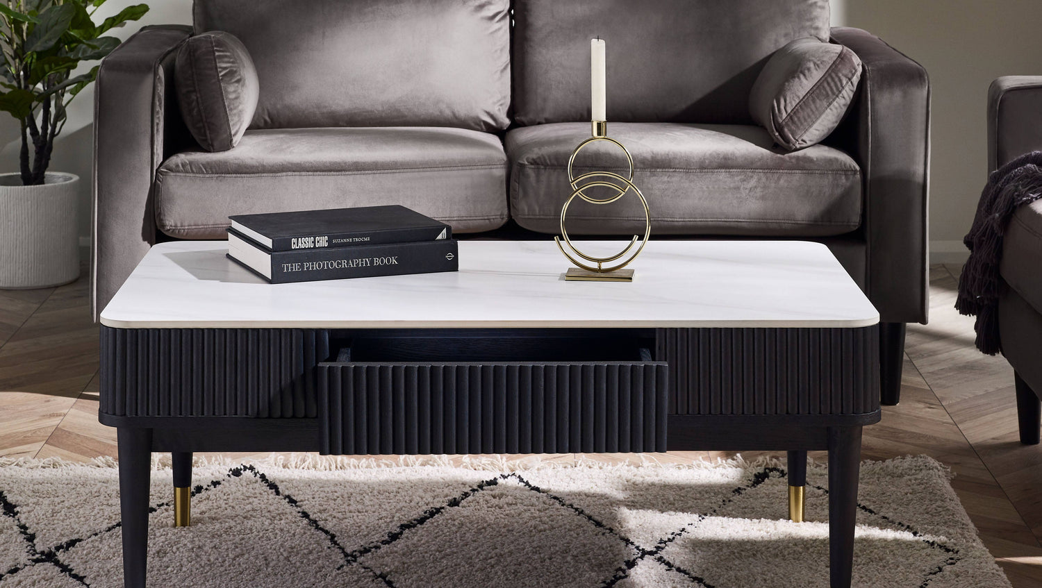 Infuse your living space with sophistication and practicality with the Louis Fluted Stone Top Coffee Table With 2 Drawers in Black. Featuring a striking white stone marble effect tabletop, this coffee table exudes timeless elegance, complemented by sleek matt black ribbed edging. The tapered legs with gold-tipped accents add a luxurious touch, making it a standout centerpiece in any room. Designed with both style and function in mind, it includes two push-touch drawers for discreet storage. With minimal assembly required, this coffee table offers an effortless way to elevate your home décor.