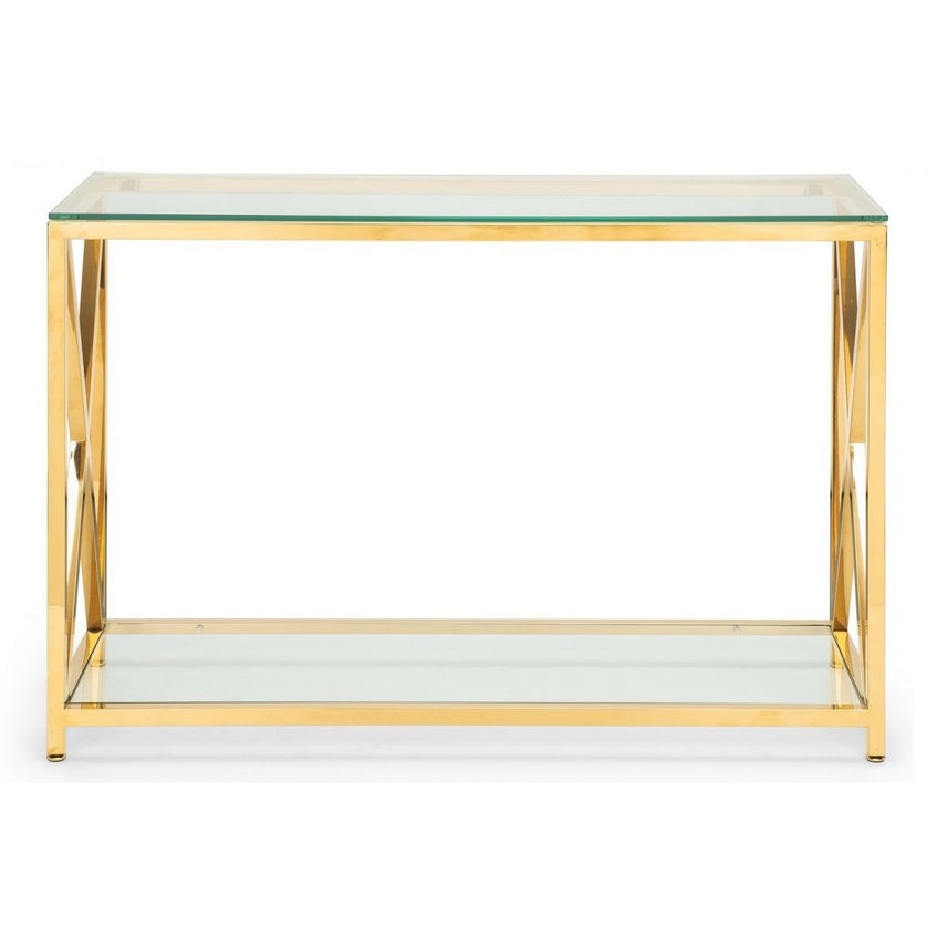 The lavish Miami occasional collection adds a touch of class and luxury to any home, inspired by the Art Deco period. Featuring a striking cross frame design, this console table is crafted from a gold-finished frame and tempered glass, providing an elegant aesthetic. An additional shelf underneath offers practical storage for your essentials.