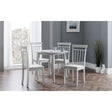 This stylish Double Drop Leaf Round Dining Set in an immaculate grey lacquered finish is the perfect combination of functionality and style. Its clean, crisp design makes it suitable for both traditional and contemporary décor. The set features high-backed dining chairs with padded ivory microsuede seats, ensuring maximum comfort during meals. The table's double drop leaf design allows the leaves to fold away easily, providing a compact and space-saving solution, ideal for smaller rooms.