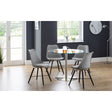 This contemporary round glass table maximizes space in any kitchen or dining area. Featuring a sturdy brushed steel base and a clean round glass top, it adds a touch of elegance to your decor. Accompanied by four Kari Chairs in grey, designed to conform to the natural curve of the spine with high-quality padded seats, this set ensures maximum comfort.