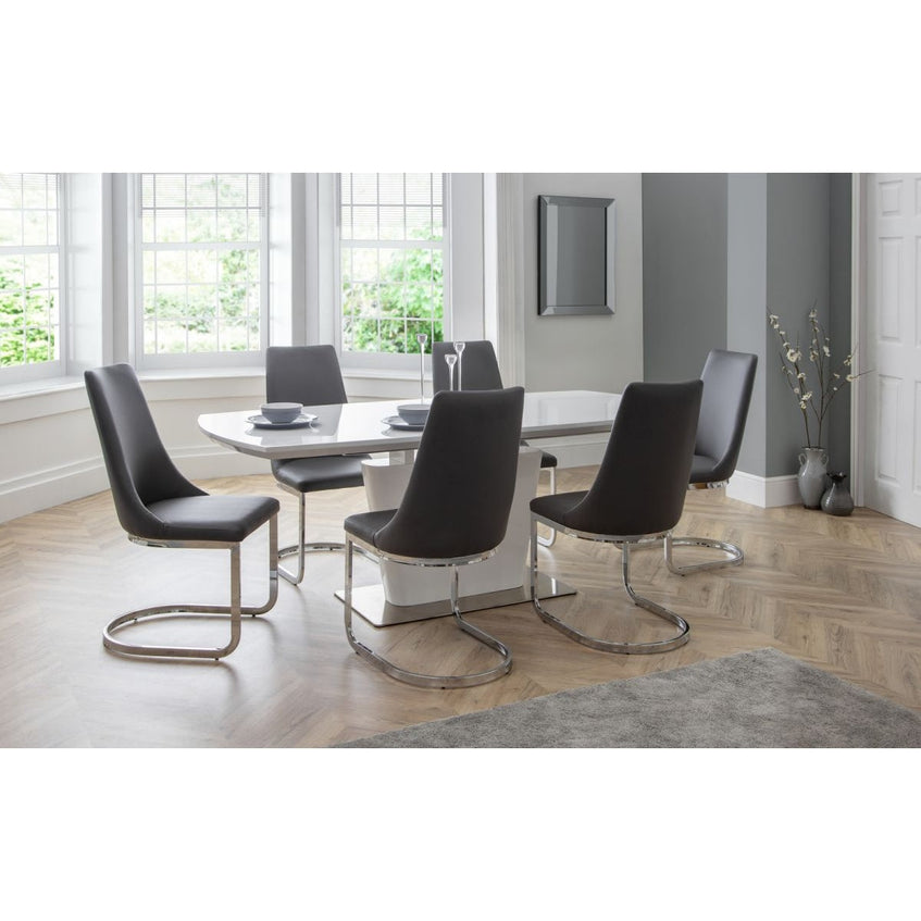 The Como Extending Dining Table combines modern style with practical functionality, creating a striking centerpiece for any dining room. Finished in a crisp white high gloss, the table's sleek surface is complemented by a sturdy chrome pedestal base that adds a touch of contemporary flair. The table features a convenient butterfly extension system, easily extending the length to 200cm to comfortably seat up to 6 people, with the extension stored within the table when not in use. Accompanied by 6 Como Cantilever Dining Chairs, upholstered in luxurious grey faux leather with stunning chrome curved bases, this set elevates the dining experience with class and sophistication.