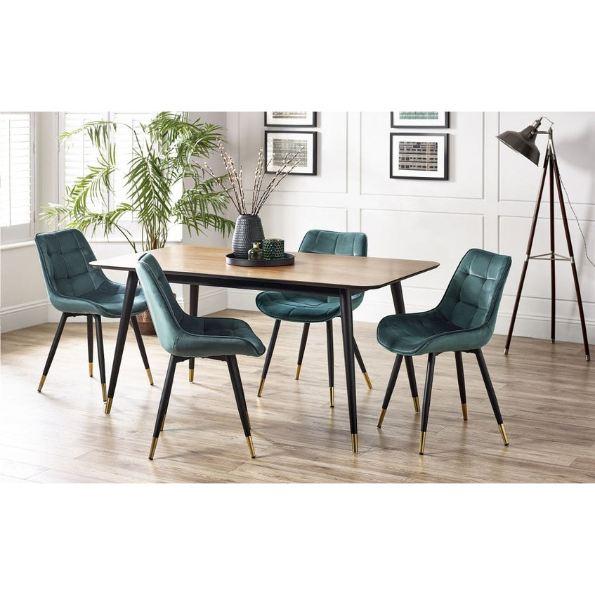 Enhance your dining room with the Findlay Rectangular Dining Table & Green Velvet Hadid Chairs, combining retro elegance and modern flair to make a stylish statement in your home.