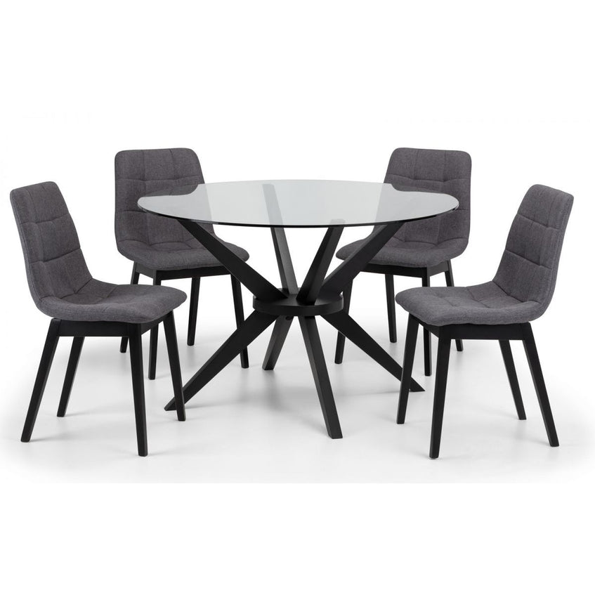 The Hayden Round Table combines a sleek, 120cm diameter tempered glass top with a modern black solid Beech base, creating a bold statement piece for your home. Perfect for drinks, dining, or casual coffee with friends, the Hayden table offers versatility and elegance that complements various décor styles. Paired with 4 matching Hayden Dining Chairs, this set creates a cohesive and stylish dining experience.