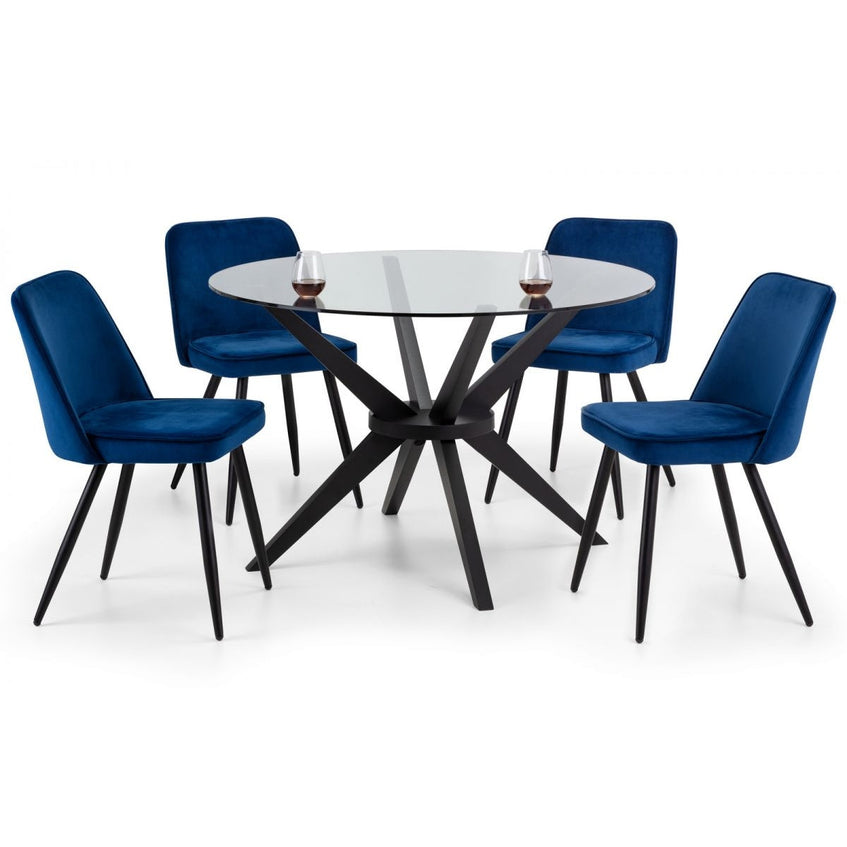 The Hayden Round Table features a 120cm diameter tempered glass top, providing a sleek and modern centerpiece for any room. Paired with a contemporary black solid Beech base, this table adds both elegance and durability to your space. Perfect for drinks, dining, or casual gatherings, the Hayden Table is versatile and fits seamlessly with various styles of décor. Featured with 4 stylish Burgess Blue Chairs, this set offers a perfect balance of style and functionality for your home.