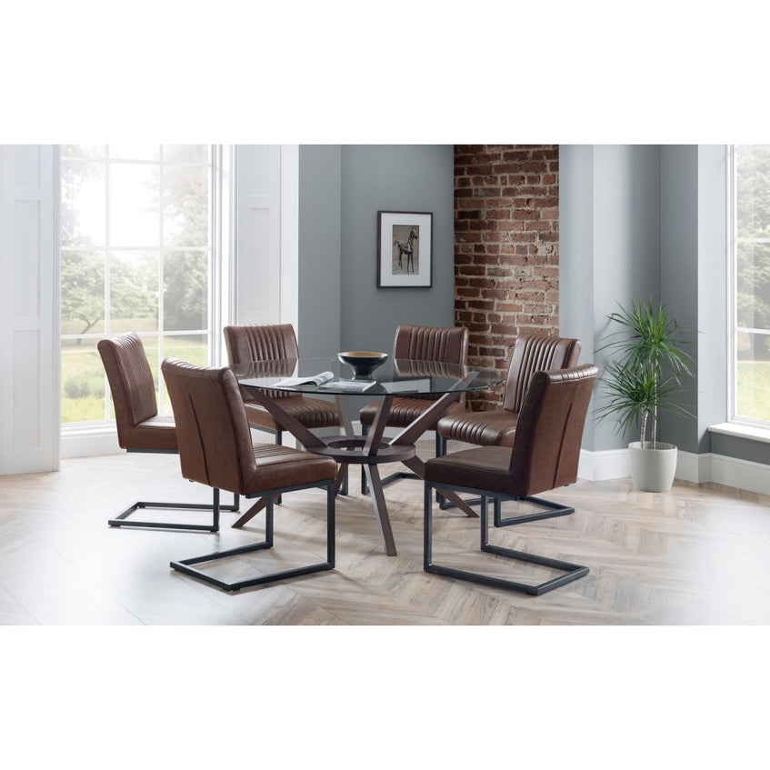 This stunning 140cm circular dining set combines contemporary elegance with industrial design, making it a standout feature in any dining space. The elegantly styled solid wood base in a rich walnut effect finish supports a substantial 10mm tempered glass top, creating a luxurious centerpiece for your home. Paired with 6 Brooklyn Dining Chairs, featuring a vintage brown faux leather finish and cantilever-style gunmetal legs, this set offers both style and comfort. The foam-padded seats ensure maximum comfort, while the retro-industrial design adds character to the set.