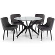 The Hayden Round Table combines a sleek, 120cm diameter tempered glass top with a contemporary black solid Beech base, creating a statement piece that elevates any room. Perfect for dining, casual drinks, or catching up with friends over coffee, this versatile table suits various décor styles. Paired with 4 luxurious Luxe Grey Chairs, this set combines modern sophistication with everyday functionality, making it a stylish and comfortable addition to your home.