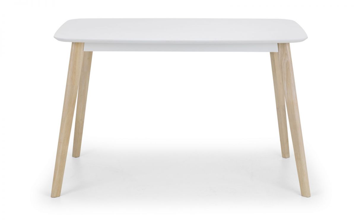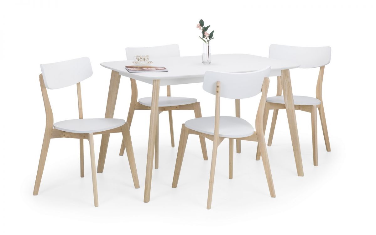 Inspired by the iconic style of the 1950s, the Casa Rectangular Dining Set adds a classic touch to any dining room. This set includes a rectangular dining table and four dining chairs, all crafted with a durable white lacquered finish on the table top and seat pads, perfectly complemented by limed oak effect legs. Built from solid Malaysian hardwood and MDF, this dining set promises long-lasting durability while maintaining a sleek retro design.