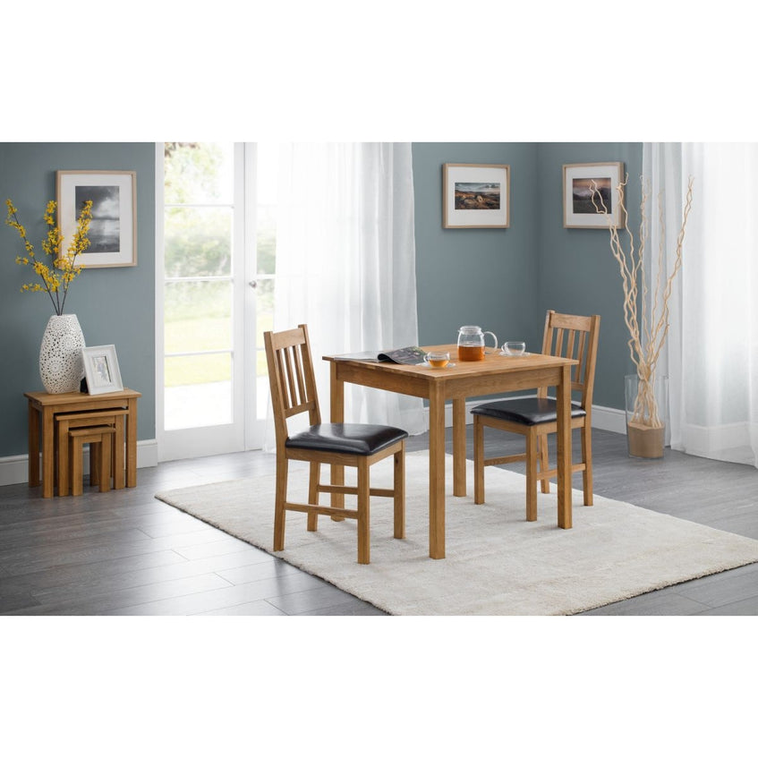 Ideal for small dining areas, the Coxmoor Compact Dining Set is crafted from solid oak, offering durability and a timeless appeal. The table and chairs feature an oiled oak finish, enhancing the natural beauty of the wood while providing a classic design that suits a variety of décor styles. The chairs are upholstered with easy-care brown faux leather seat pads, combining comfort with practicality. With its compact size, this dining set is perfect for smaller kitchen diners, and it coordinates beautifully with other items in the Julian Bowen Coxmoor range.