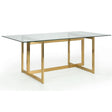 Elevate your dining space with the Minori Dining Table, designed with an unwavering focus on luxury. This exquisite table features striking gold geometric legs that form a bold statement piece, perfectly paired with a sleek glass top to create a sophisticated aesthetic. The Minori table transforms any kitchen or dining area into a realm of upscale elegance with its clean lines and shimmering surfaces.