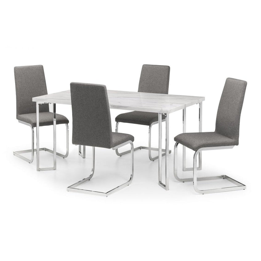Introducing the Positano Dining Table, a stunning blend of style and functionality crafted from a sleek marble effect top on a robust stainless steel frame. This table showcases individual angled framed legs that exude a futuristic feel, making it a striking centerpiece for any modern dining space.