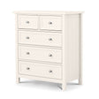 The Maine 3+2 Drawer Chest exemplifies elegant New England style, featuring an exquisite surf white lacquered finish that enhances any bedroom decor. With characteristic side paneling and detailed chamfered cabinetry, this chest creates a soothing and refined aesthetic with timeless appeal. Delicate pewter handles add the perfect finishing touch, offering excellent storage with three large drawers topped by two smaller drawers.