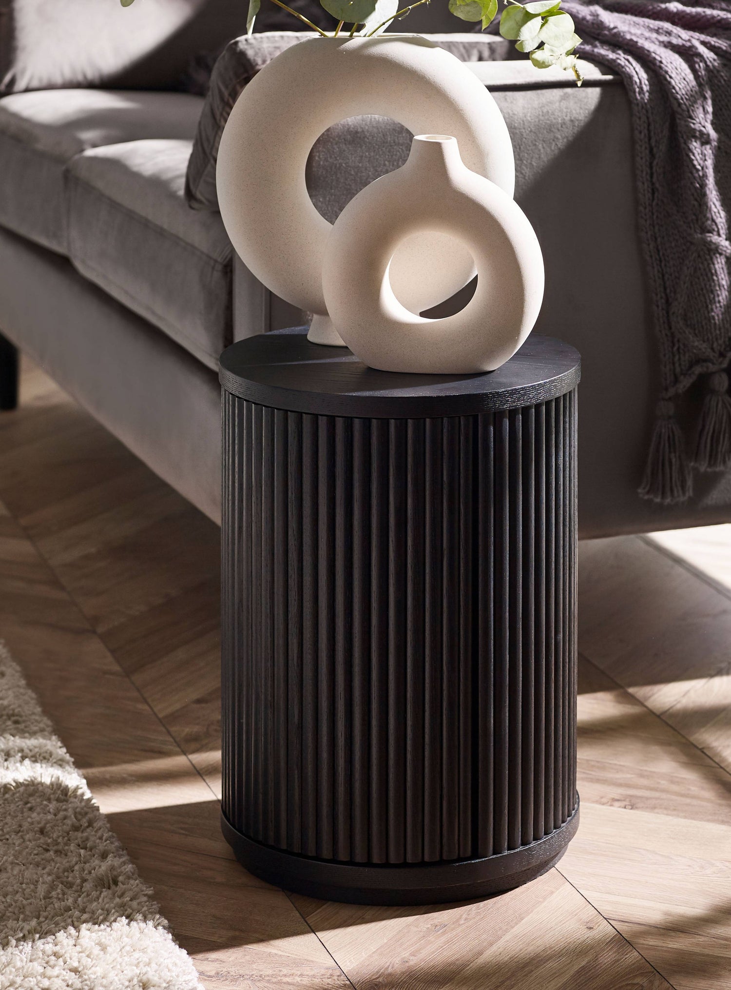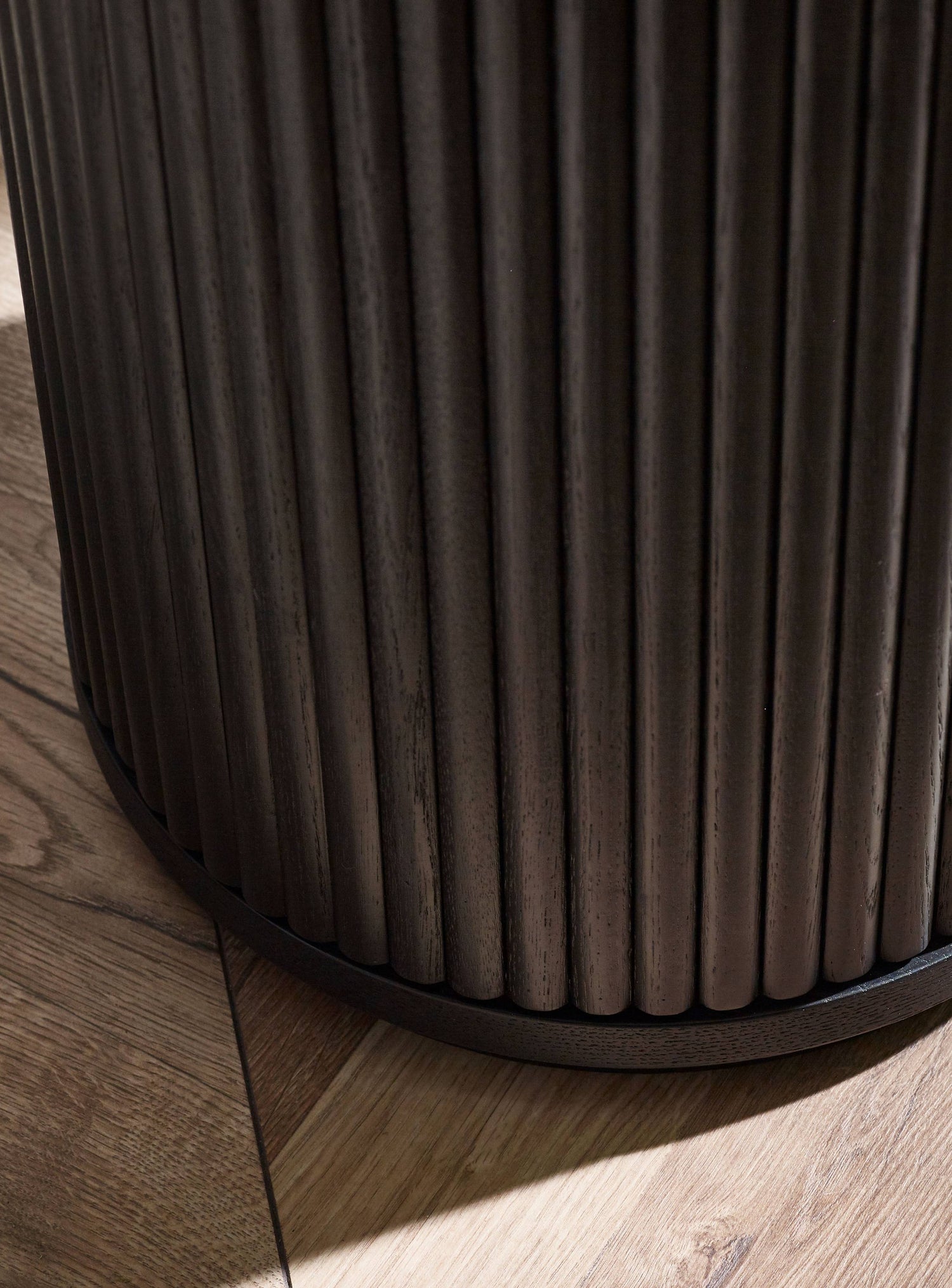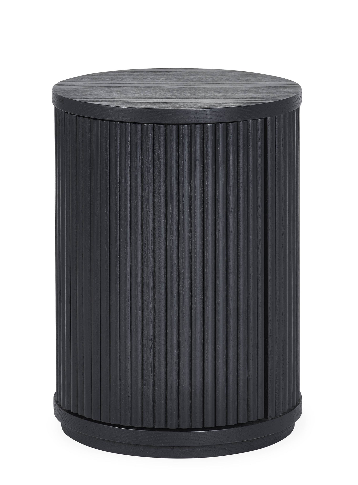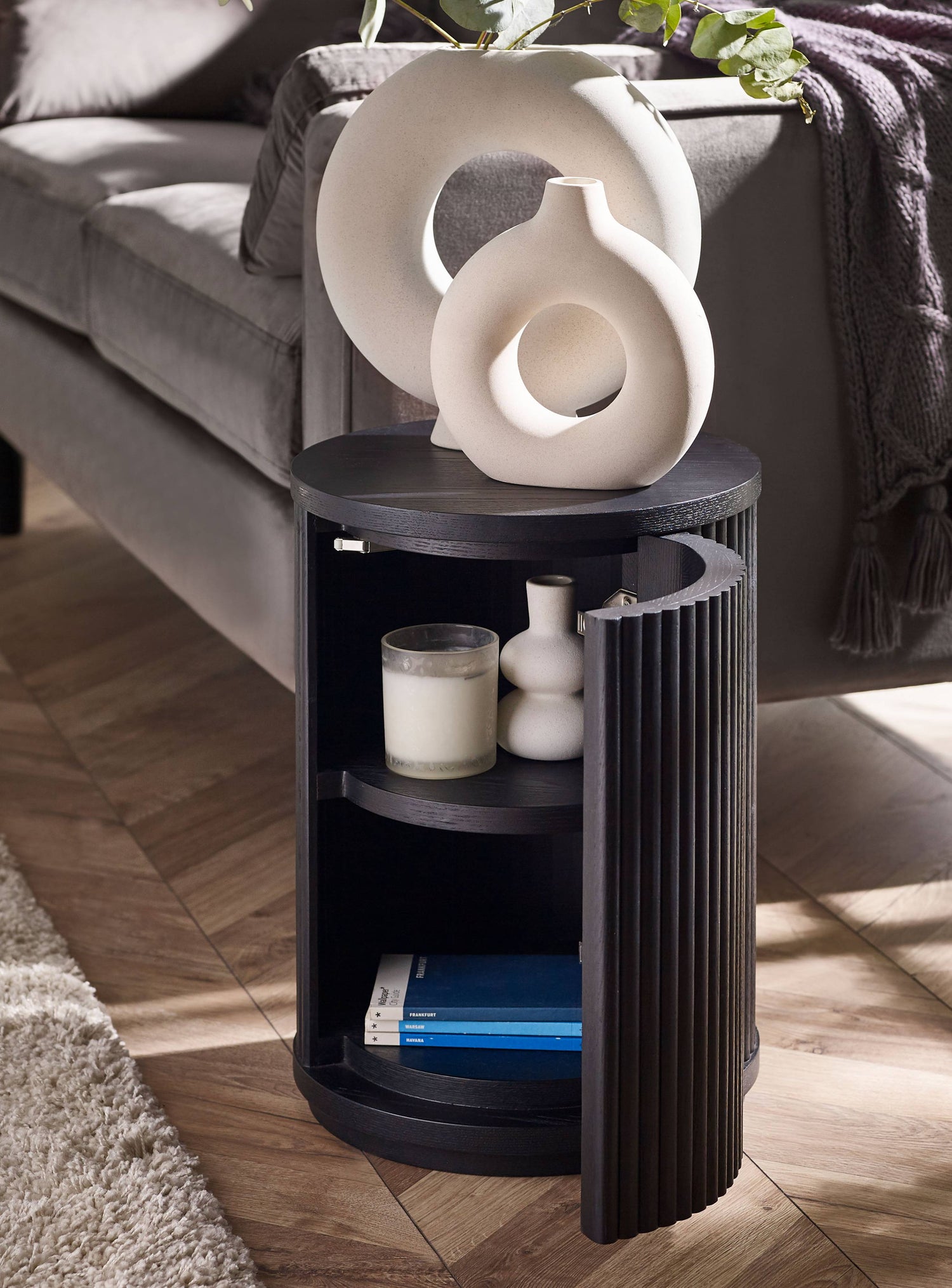 Experience timeless elegance with the Louis Side Table in Black, a stunning blend of sophistication and functionality. This circular masterpiece, adorned with intricate fluted detailing, serves as a luxurious focal point in any living space. Finished in a sleek matt black, it exudes contemporary charm while seamlessly blending with various décors. The push-touch door reveals hidden shelving space, offering a discreet and stylish storage solution for your essentials. Designed for effortless setup, this side table lets you indulge in instant elegance and practicality with minimal assembly required.