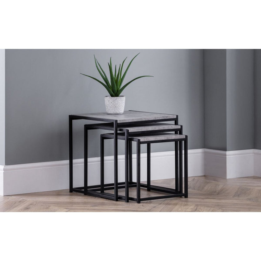 Simplistic in design with a contemporary style, the Staten Nest of Tables adds a stunning industrial look to any living or dining area. Constructed from a robust black-coated metal frame and complemented by striking concrete effect tops, this set creates a stylish and modern product.