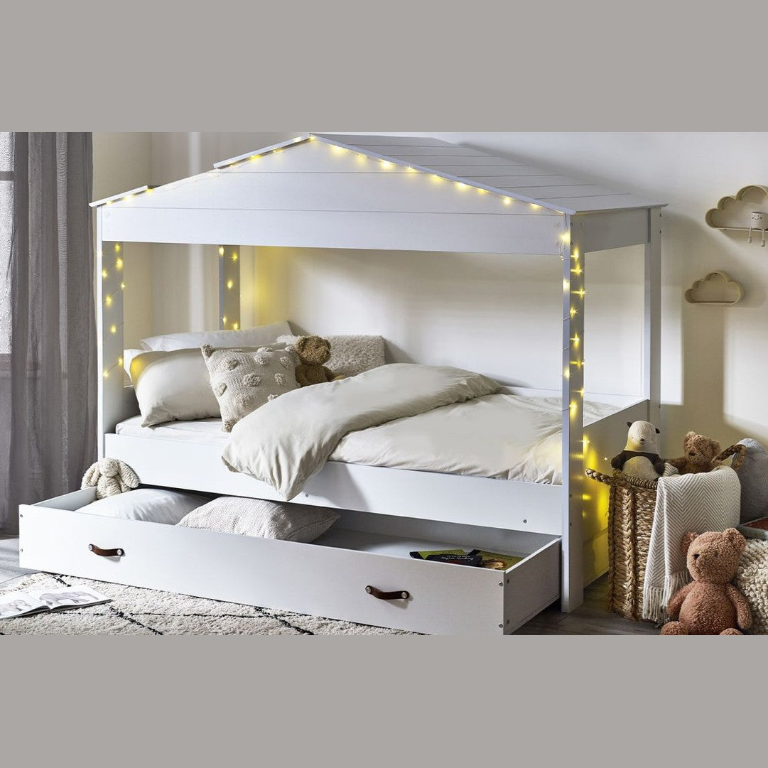 Welcome to the magical world of the Hazel Low Sleeper, a charming white hut house bed designed to ignite imagination and joy. This delightful bed features a panelled roof and a unique open gap for stargazing, turning bedtime into a special adventure for little dreamers. With a spacious underbed drawer, it provides ample storage for treasures and essentials, keeping the room neat and clutter-free. Thoughtfully crafted for children’s safety, two accessible trap handles ensure easy and secure access to their cozy retreat. Perfect for creating a room where bedtime stories come to life and dreams soar.