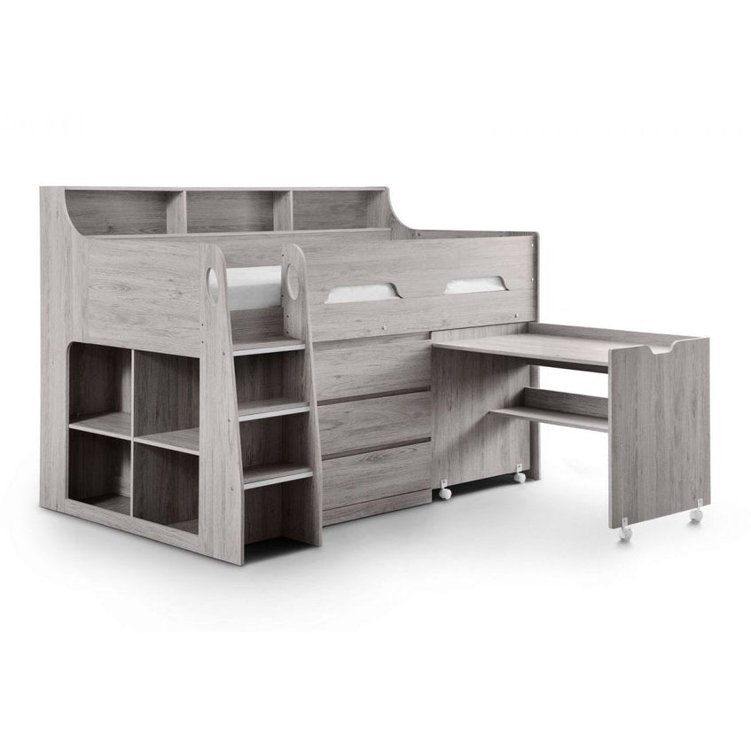 The Jupiter Midsleeper is designed to maximize space and functionality in your child's bedroom. This versatile piece features a built-in chest of drawers, ample shelving, and a convenient pull-out desk, making it the ideal choice for a fresh, modern design. Available in two stylish color options—White or Grey Oak—this midsleeper seamlessly fits into various décor styles.