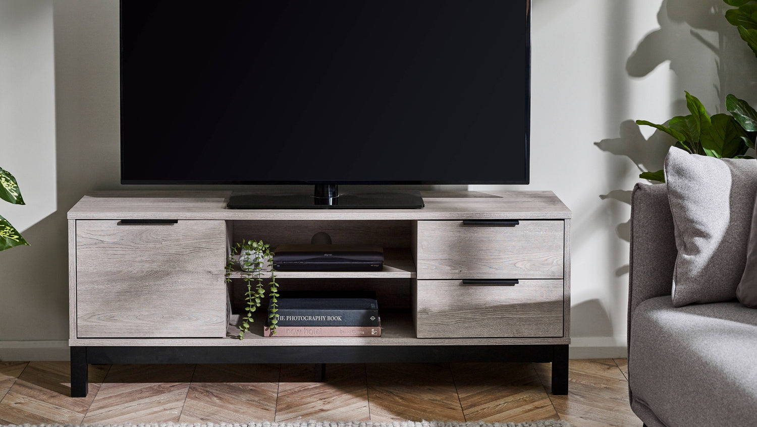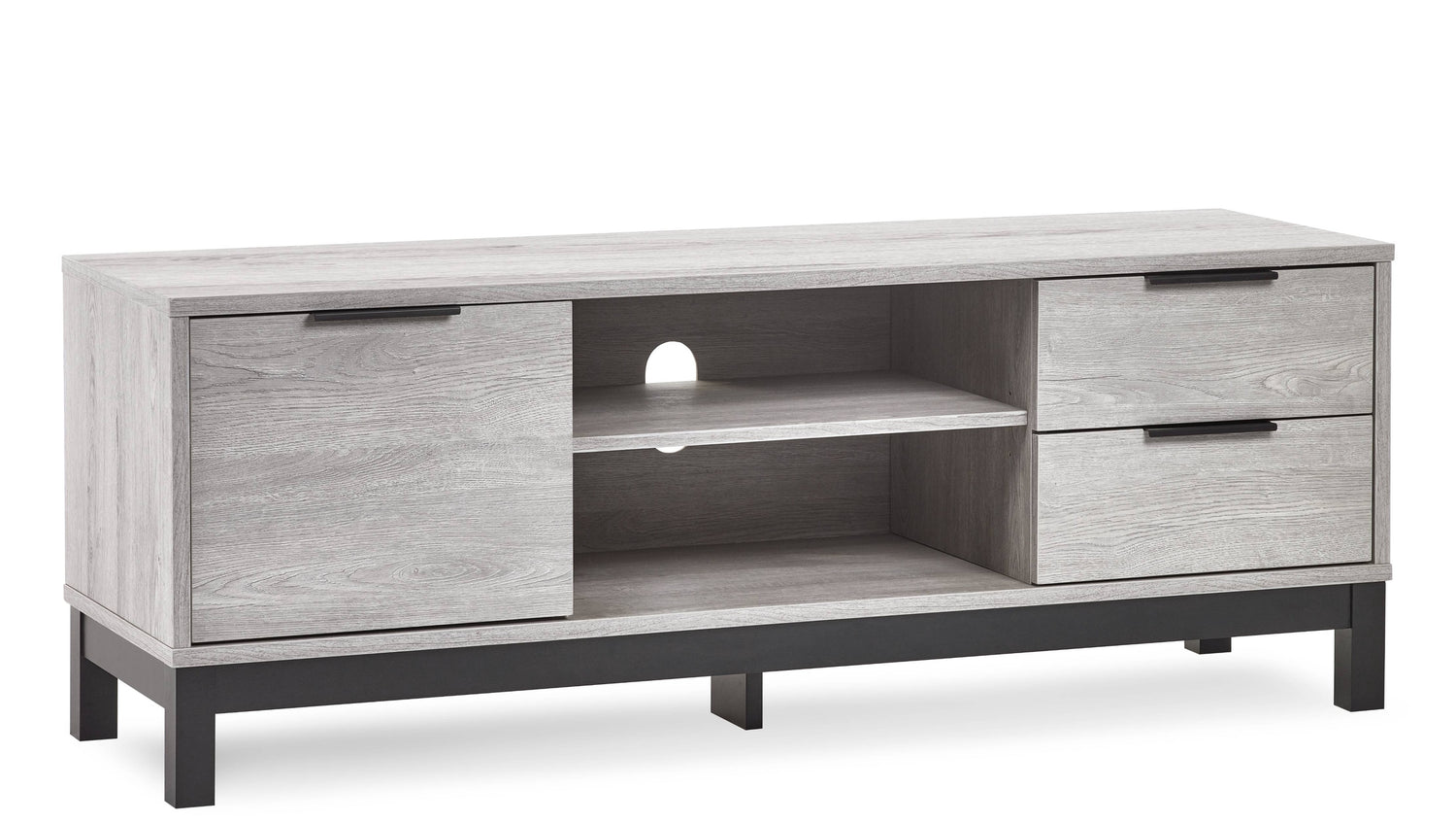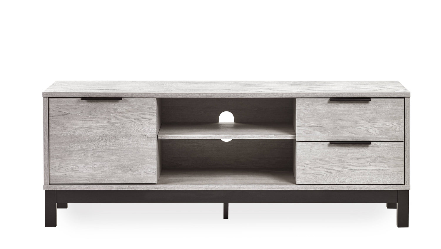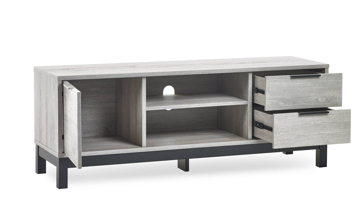 - Sophisticated Grey Oak Finish: The Bali TV Unit showcases a modern grey oak finish that adds a sophisticated touch to your living room. The contrasting black legs and handles enhance its industrial aesthetic, offering a striking visual balance that complements any décor.