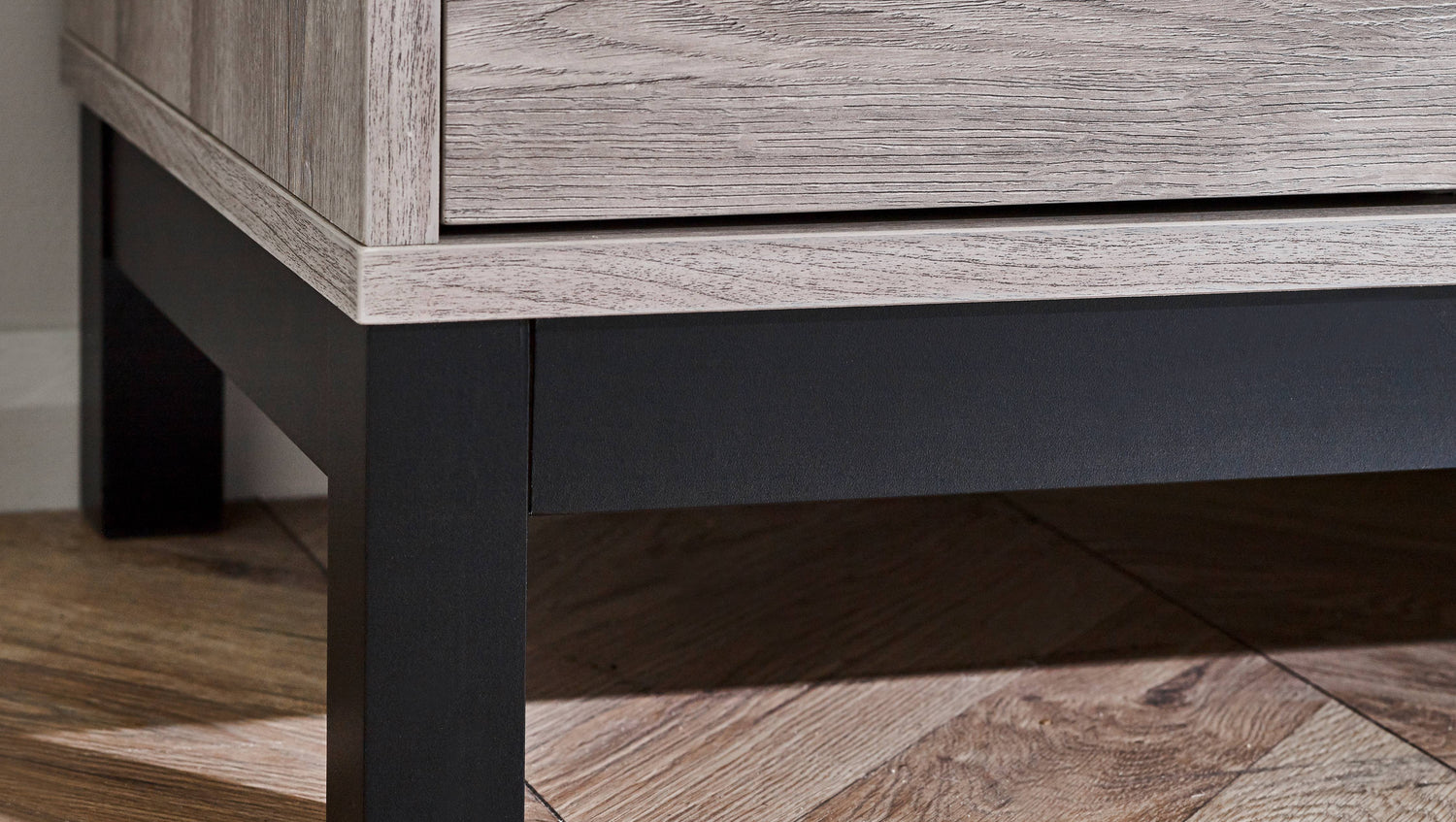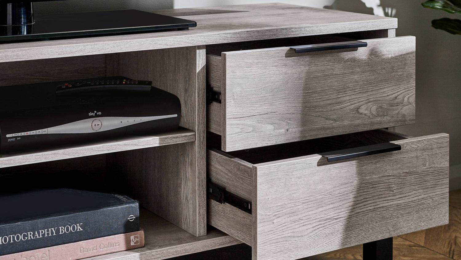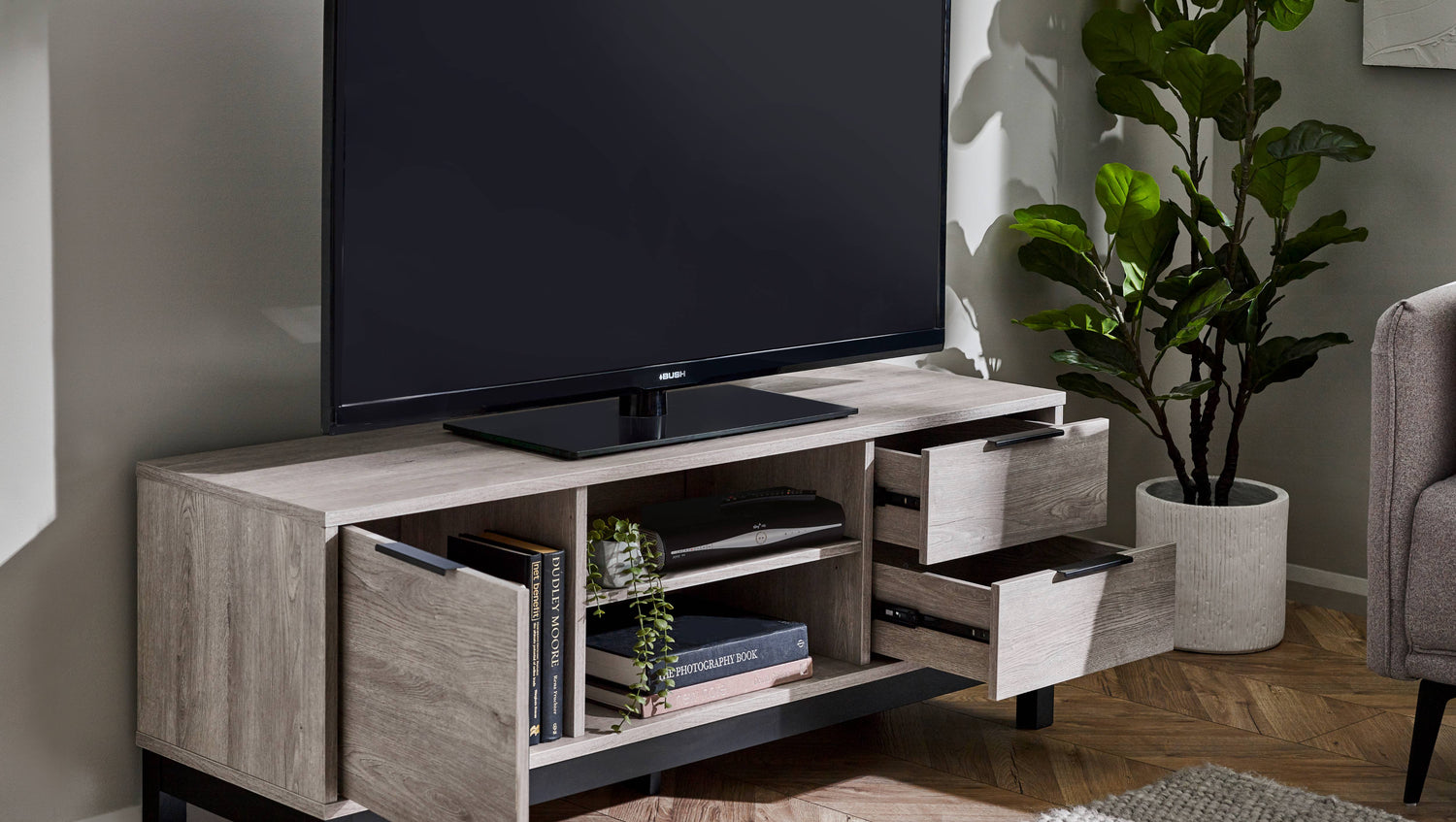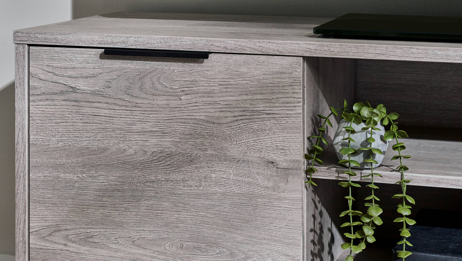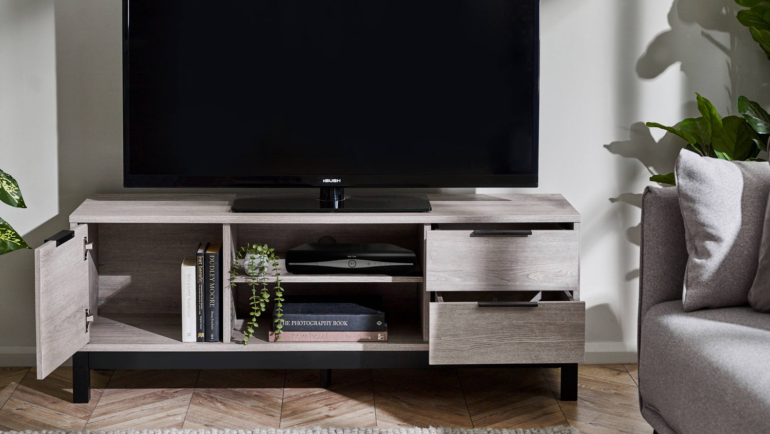 - Sophisticated Grey Oak Finish: The Bali TV Unit showcases a modern grey oak finish that adds a sophisticated touch to your living room. The contrasting black legs and handles enhance its industrial aesthetic, offering a striking visual balance that complements any décor.