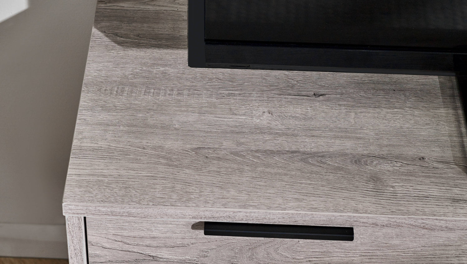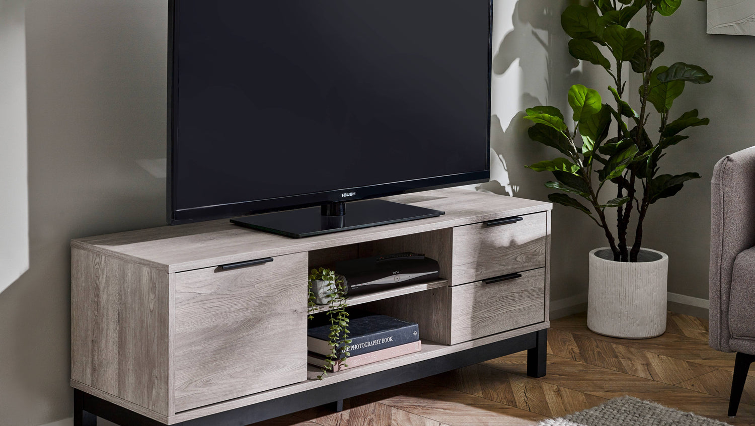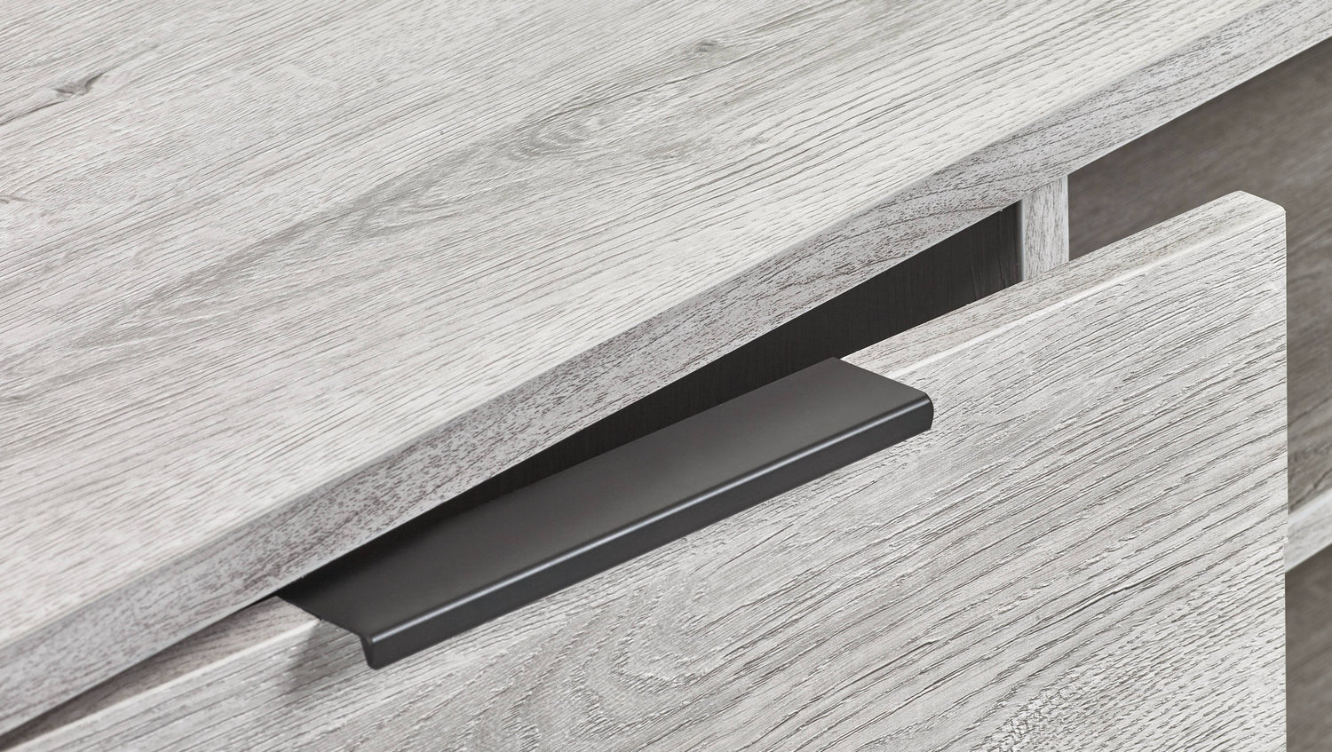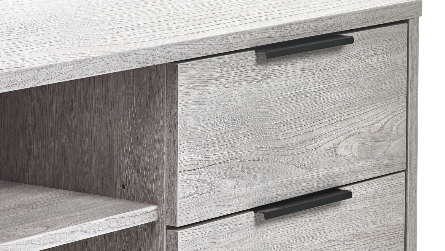 - Sophisticated Grey Oak Finish: The Bali TV Unit showcases a modern grey oak finish that adds a sophisticated touch to your living room. The contrasting black legs and handles enhance its industrial aesthetic, offering a striking visual balance that complements any décor.