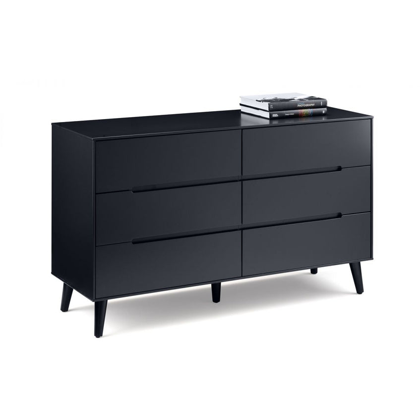 Discover versatile elegance with the Alicia Wide Chest, a stylish retro-inspired piece that combines functionality with aesthetic appeal. Finished in an immaculate matt anthracite lacquer, this wide chest features six spacious drawers and is supported by complementary tapered black finish legs. The recessed handles provide effortless opening, while the sleek Scandinavian design allows it to seamlessly fit into any décor. This beautiful chest can also serve as a chic dressing table.
