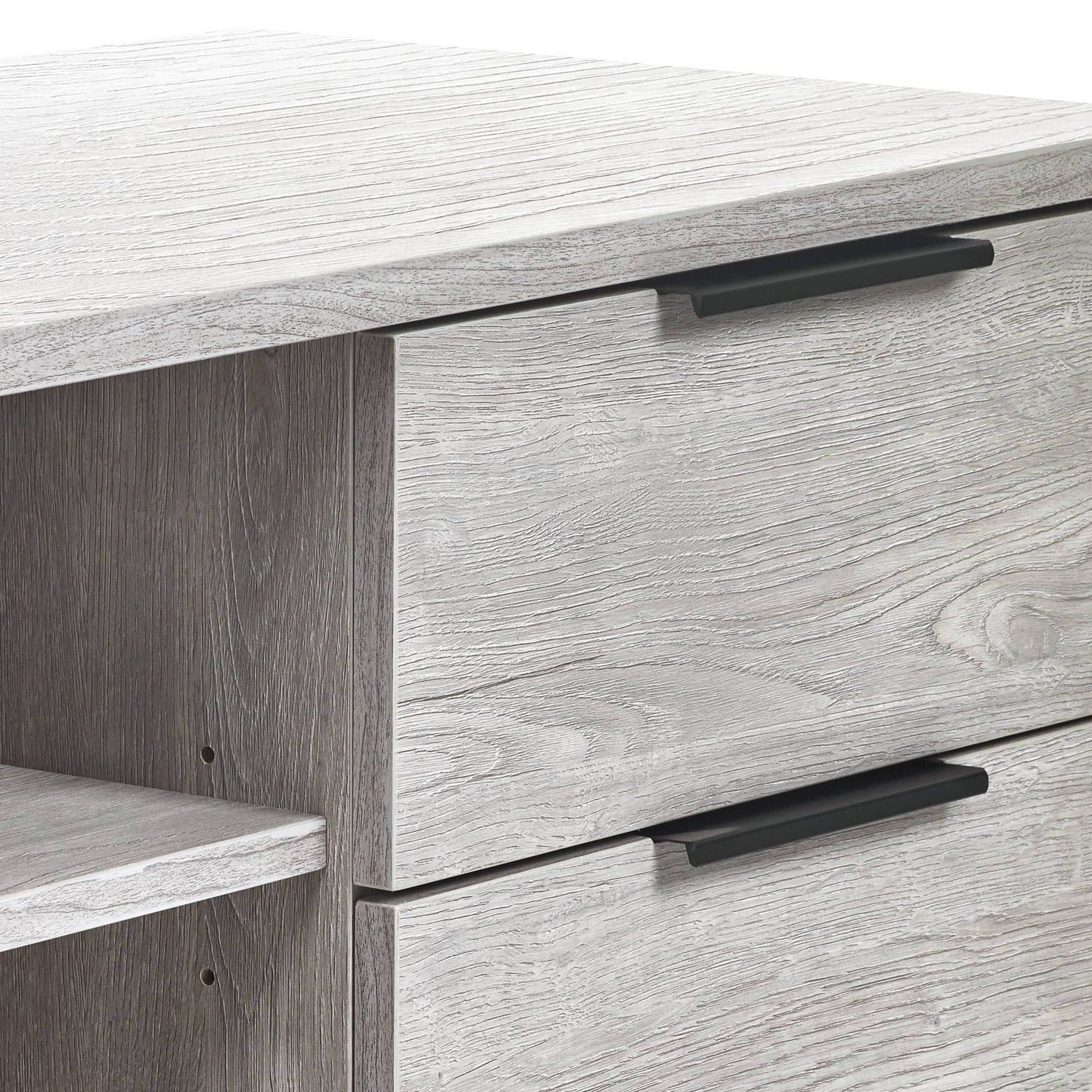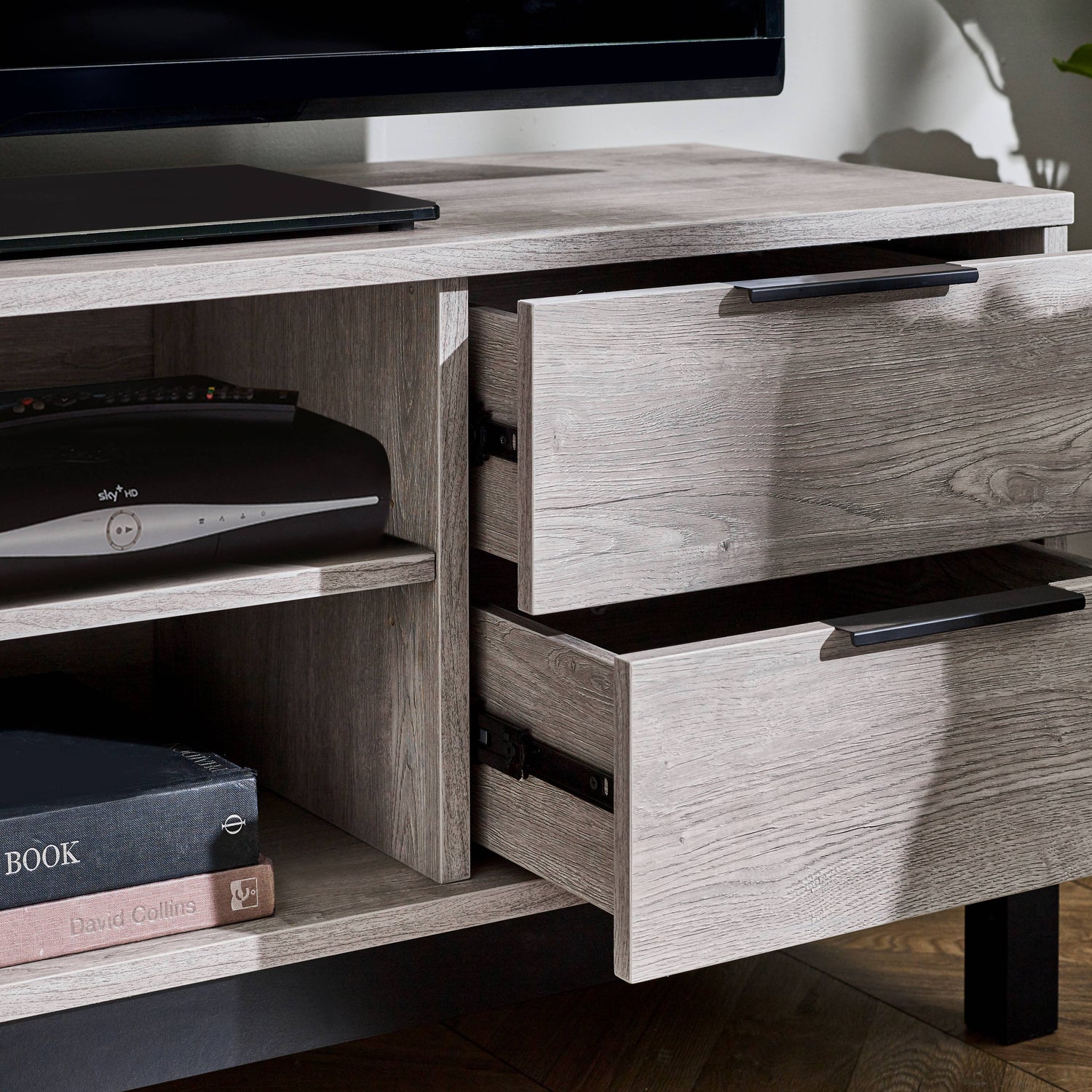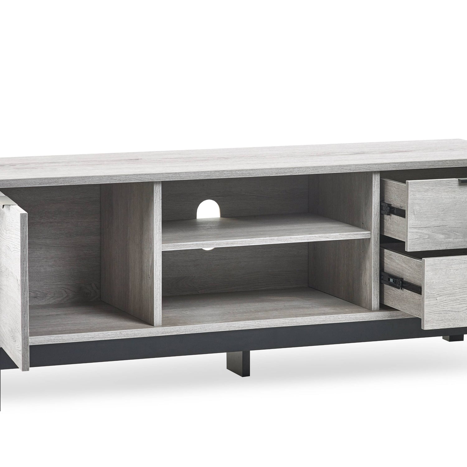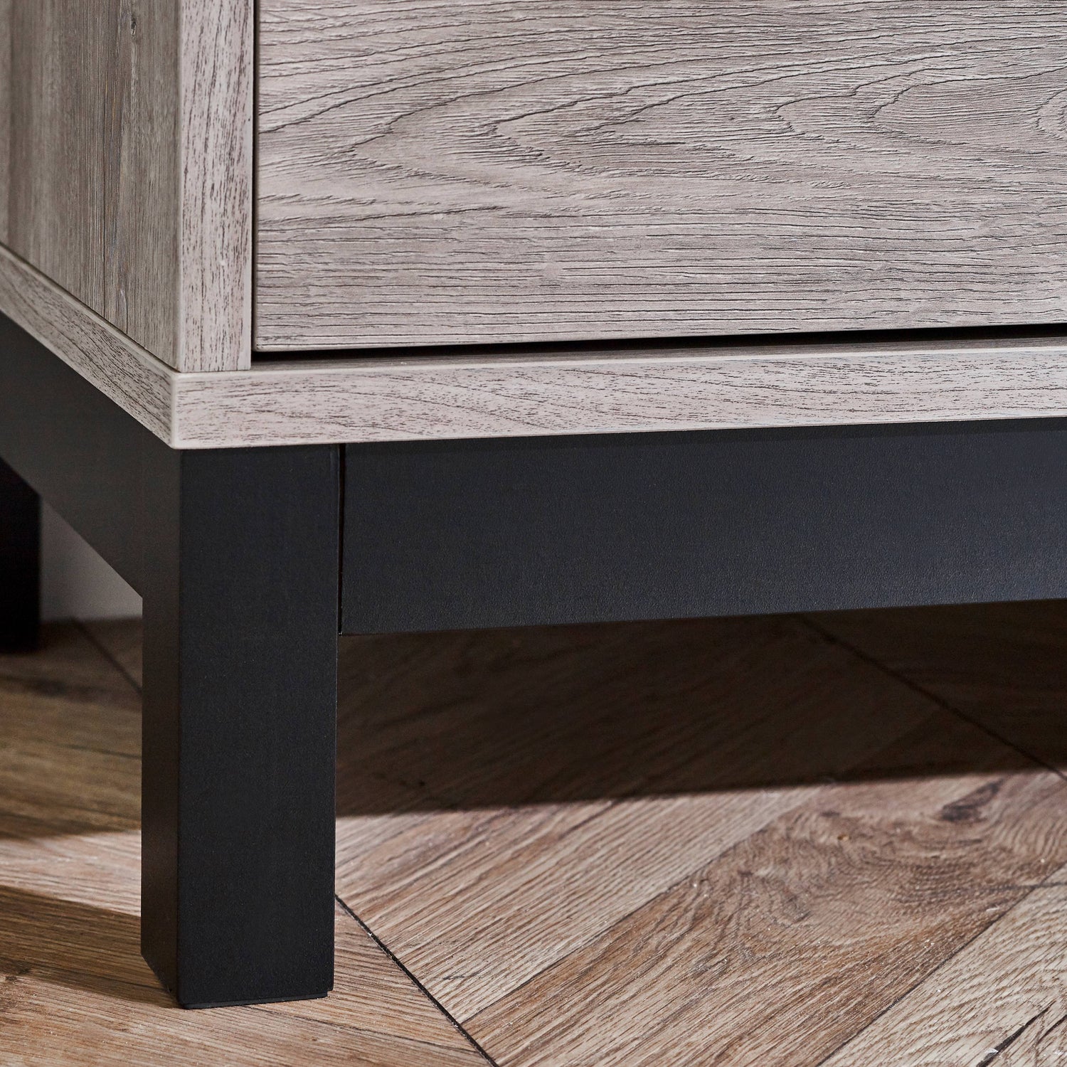 • Sophisticated Grey Oak Finish: The Bali TV Unit showcases a modern grey oak finish that adds a sophisticated touch to your living room. The contrasting black legs and handles enhance its industrial aesthetic, offering a striking visual balance that complements any décor.