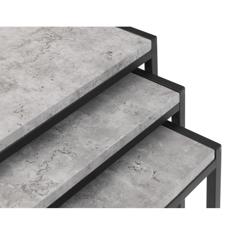 Simplistic in design with a contemporary style, the Staten Nest of Tables adds a stunning industrial look to any living or dining area. Constructed from a robust black-coated metal frame and complemented by striking concrete effect tops, this set creates a stylish and modern product.